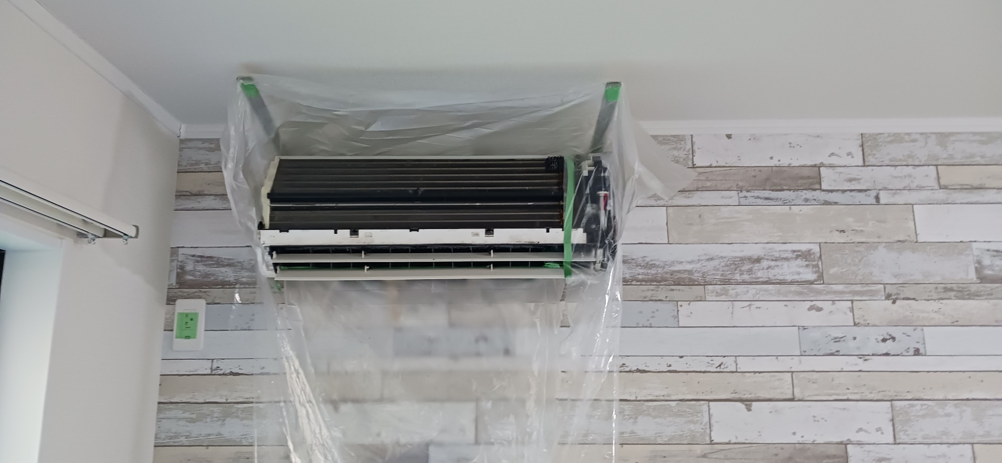 | ご訪問後、エアコン周辺を養生します。 その後エアコン本体を分解していきます。 |